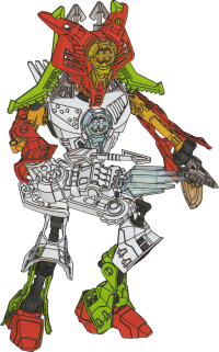 Appearance: Gorn's armor is modeled after that of a medieval knight, or whatever the Hero factory equivalent would be. The armor is black, with red highlights. His eyes and core are red as well. His helmet is based on a flat-topped medieval great helm. At the moment, it has had horns added to the top for protection against brains. He's not as bulky as one would think, only about the size of a standard hero. He also wears a large dark grey cape with a hood, simply because he thinks it looks cool. That philosophy probably also applies to most of his other gear, though he denies it.